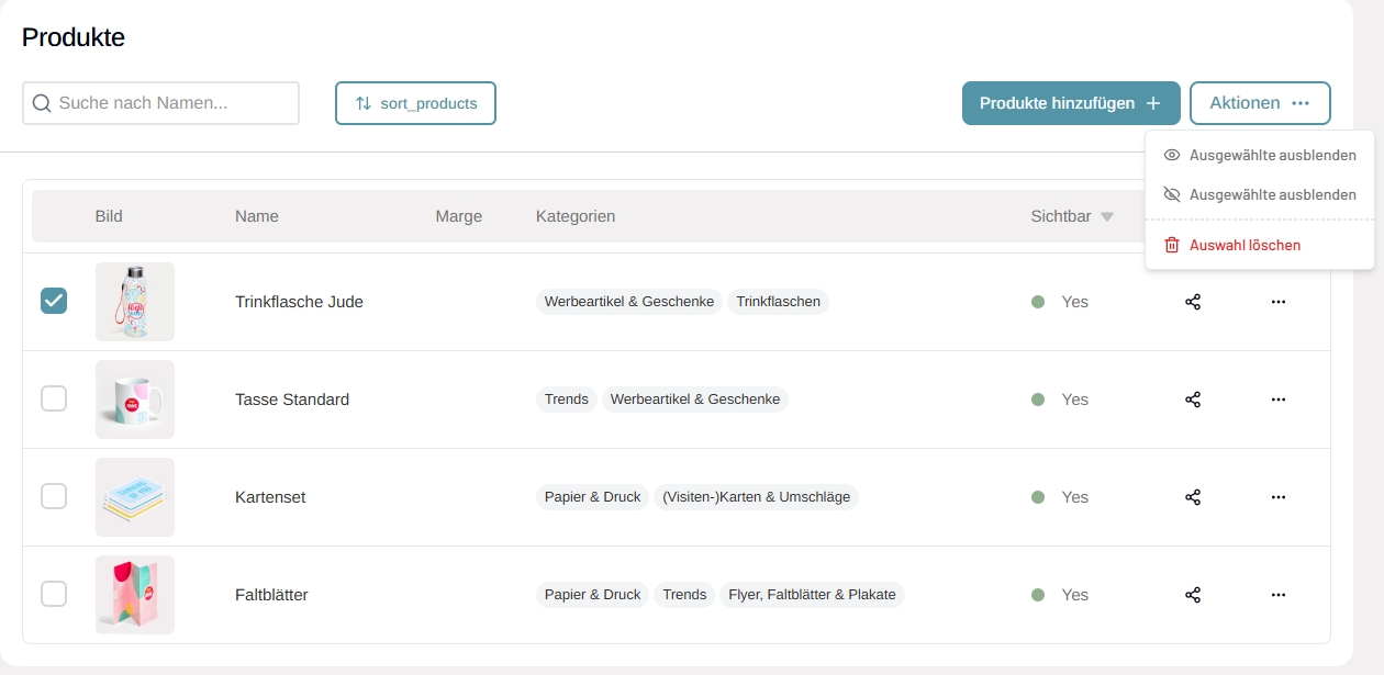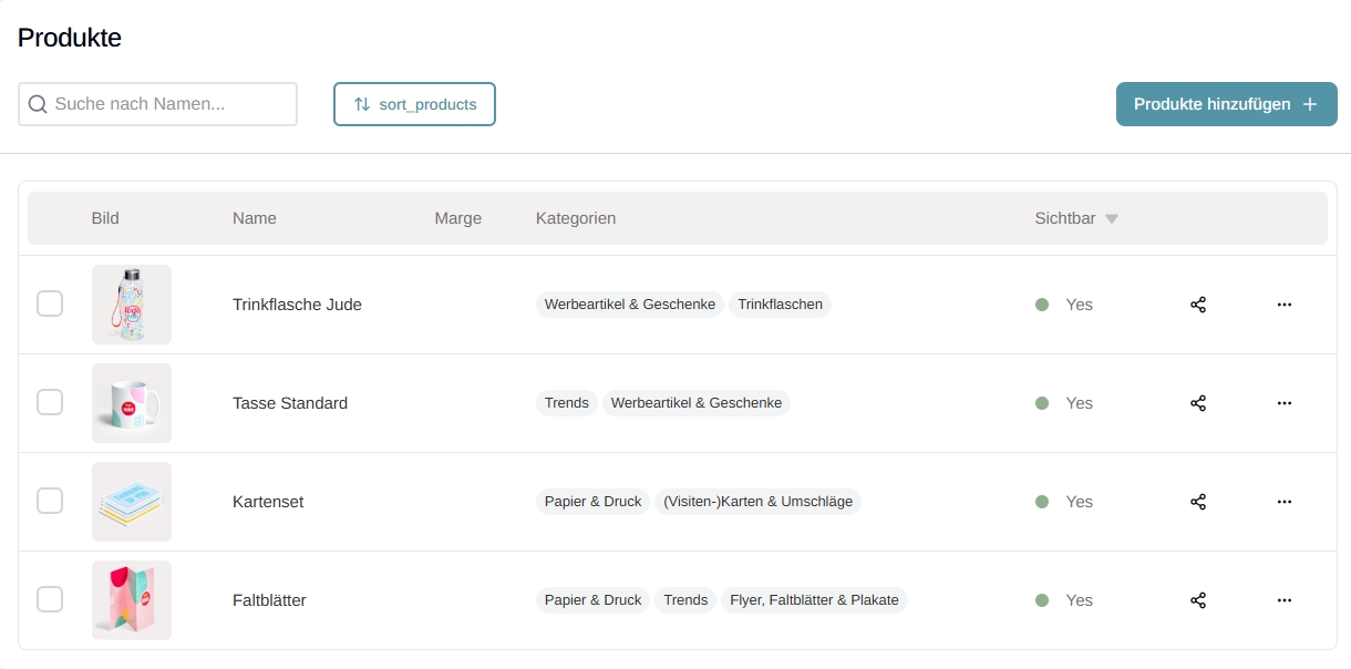 Sobald die Produkte hinzugefügt wurden, erscheinen sie in der Übersicht. Hier sehen Sie die Standardmarge (%), die Produktkategorie sowie, ob das Produkt aktiv ist oder nicht.