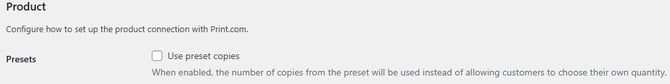Here you configure the product connection with Print.com. You have the option to enable Use preset copies. When you select this option, the predefined number of copies will be used. Customers will not be able to choose the quantity themselves.