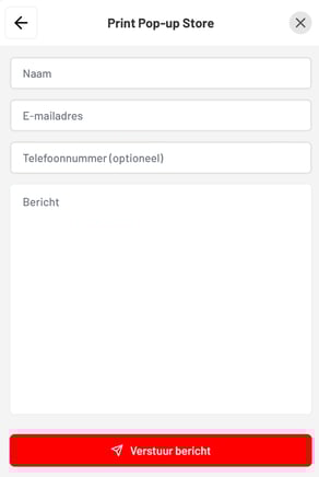 De chatfunctie is vervangen door een overzichtelijk contactformulier. Wanneer een bezoeker in de Pop-up Store op Neem direct contact op klikt, opent een formulier waarin direct naam, e-mailadres, telefoonnummer (optioneel) en een bericht kunnen worden ingevuld. Zo ontvang je alle belangrijke informatie meteen in één duidelijk bericht.